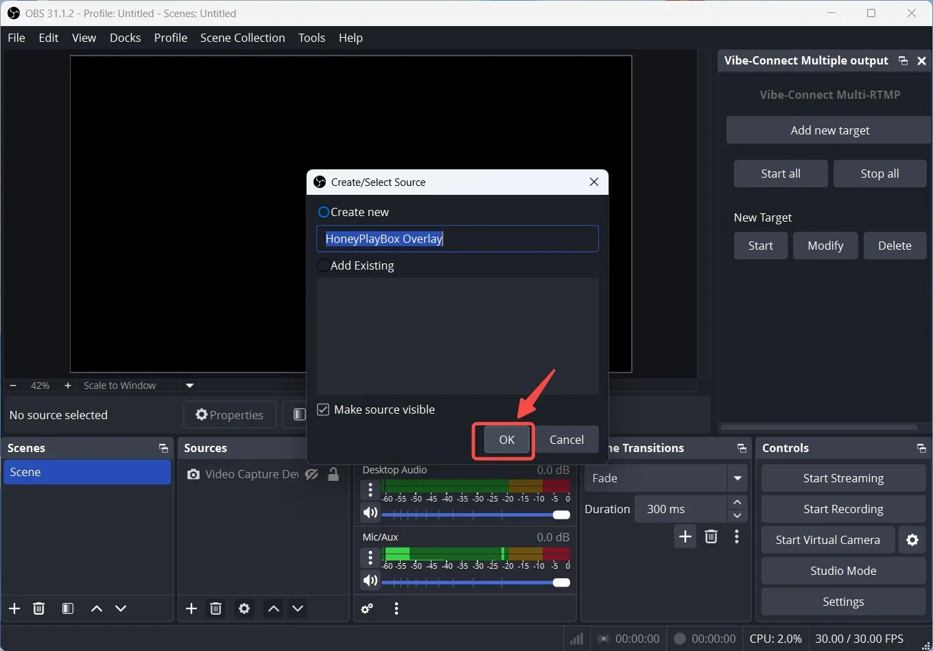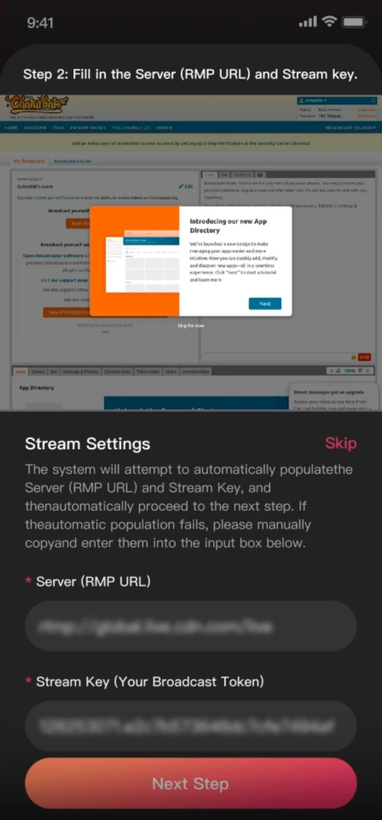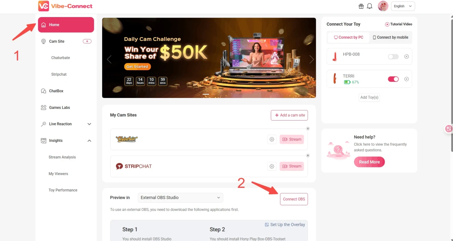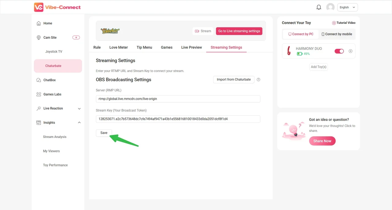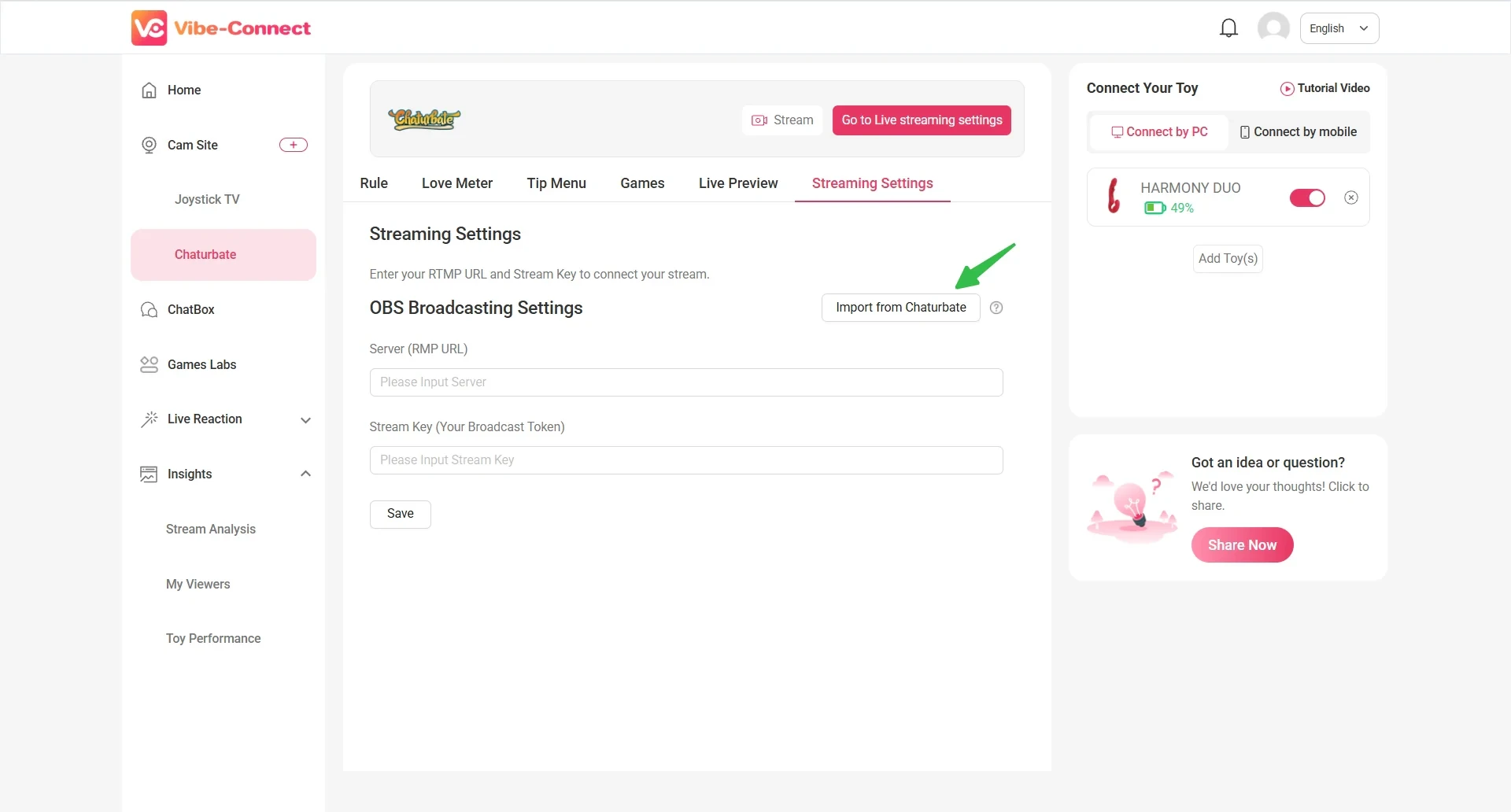 After logging in to the cam site, return to Vibe-Connect and click “Import from Chaturbate” again to sync the streaming settings automatically.