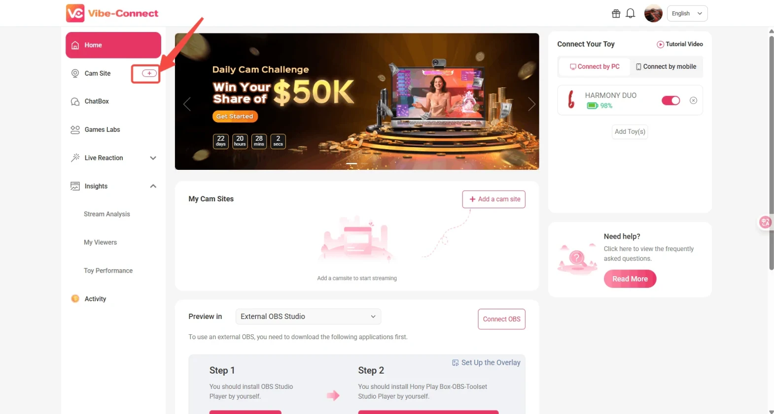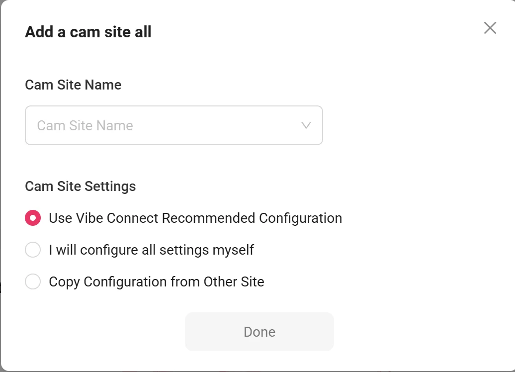 In the “Cam Site” menu, click the “+” button and choose the cam site from the drop-down list.