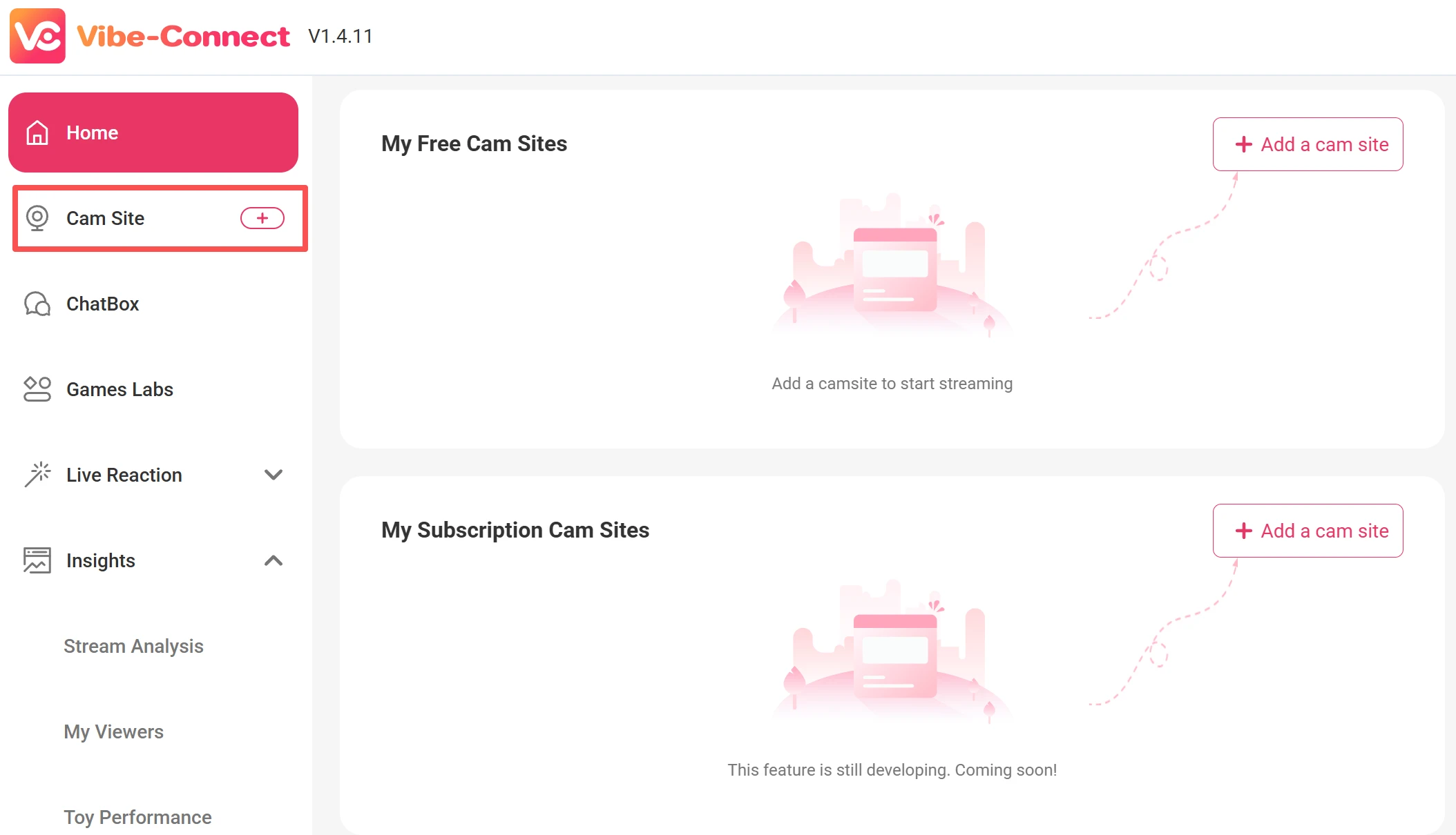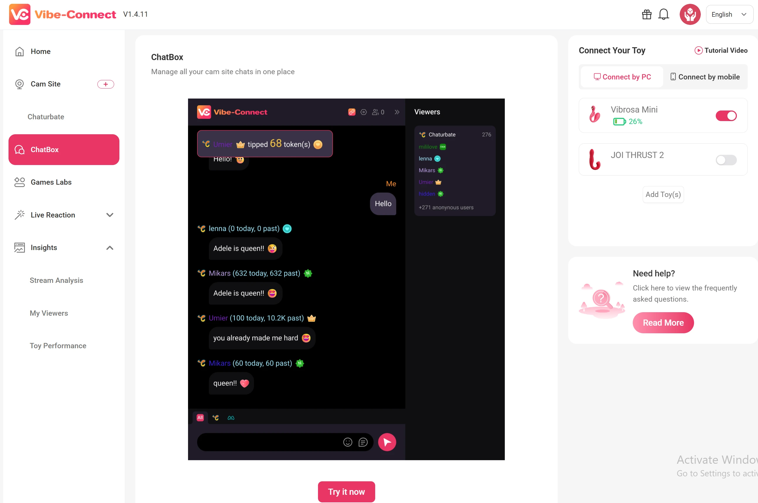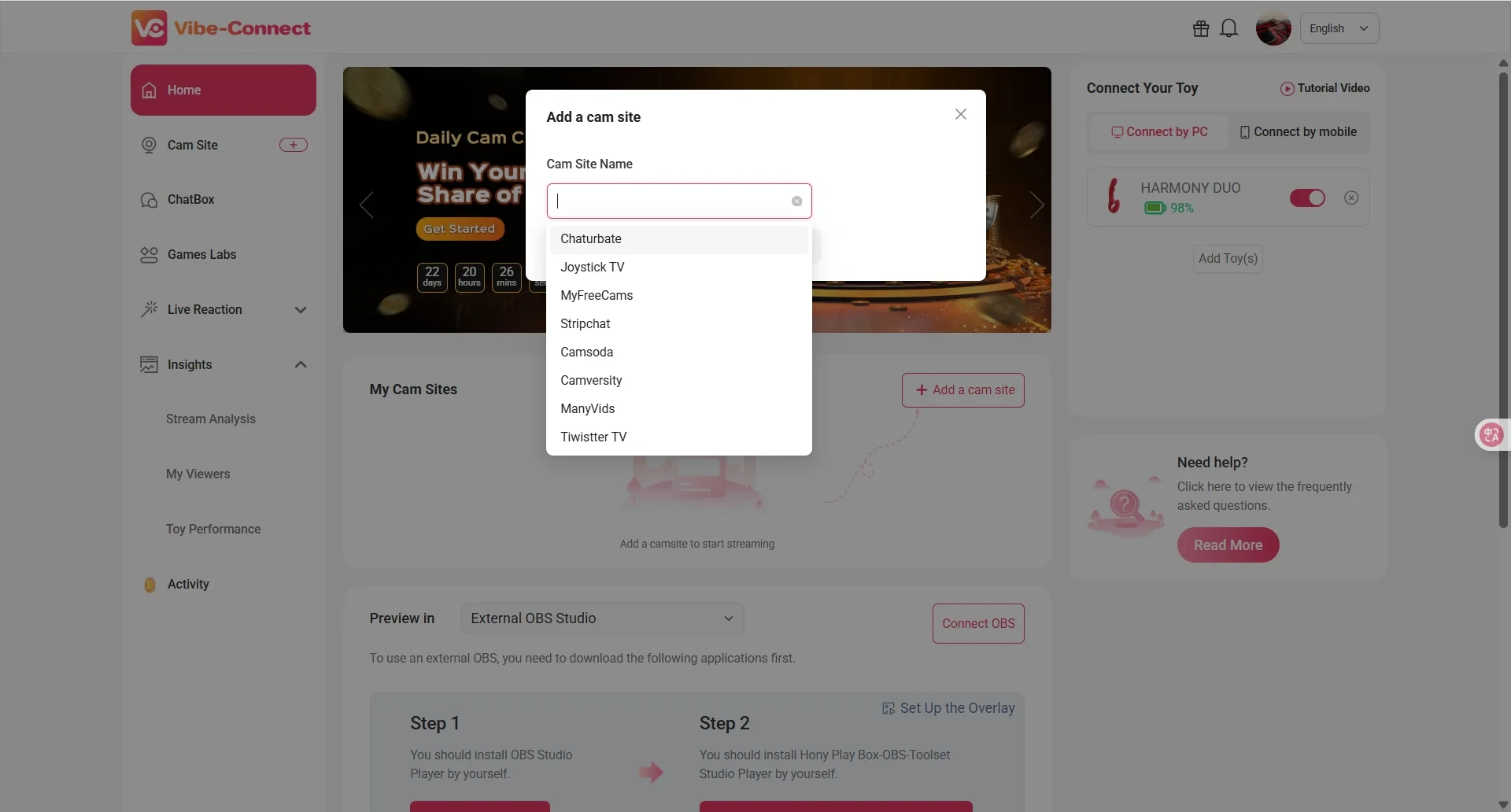 Vibe-Connect supports popular camming platforms such as Joystick.tv, Chaturbate, CamSoda, Camversity, MyFreeCams, and more.