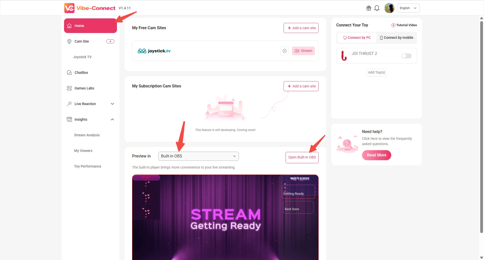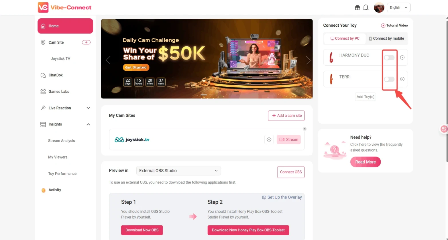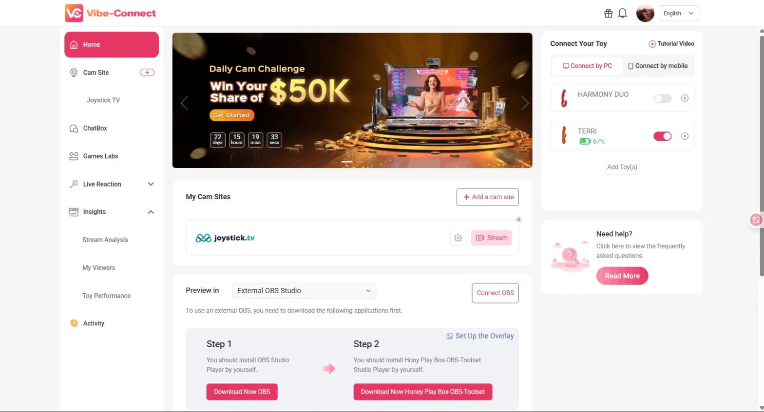 Vibe-Connect supports popular camming platforms such as Joystick.tv, Chaturbate, CamSoda, Camversity, MyFreeCams, and more.