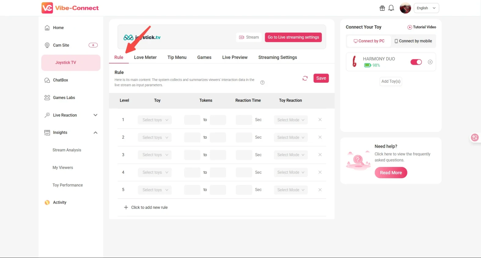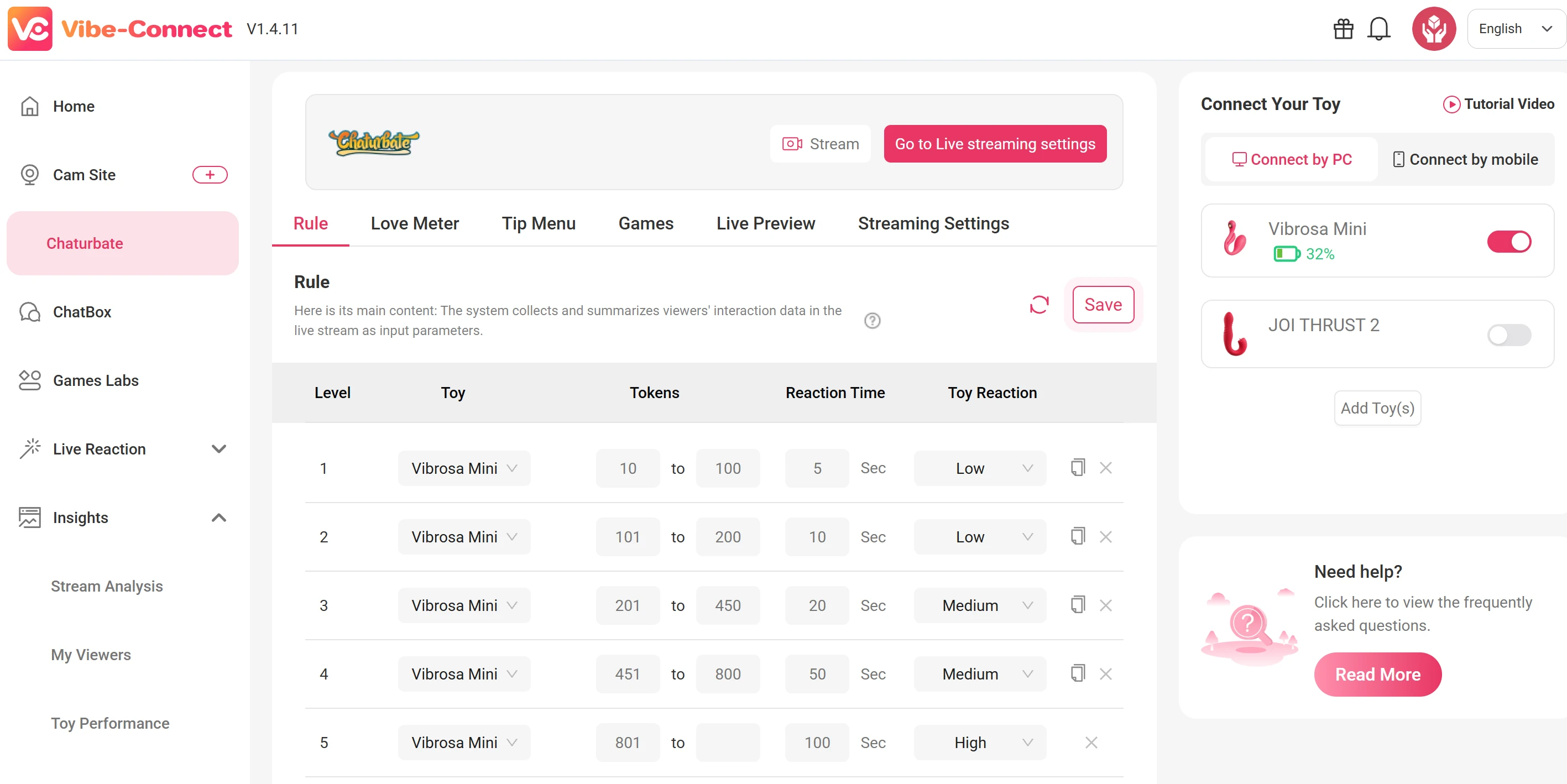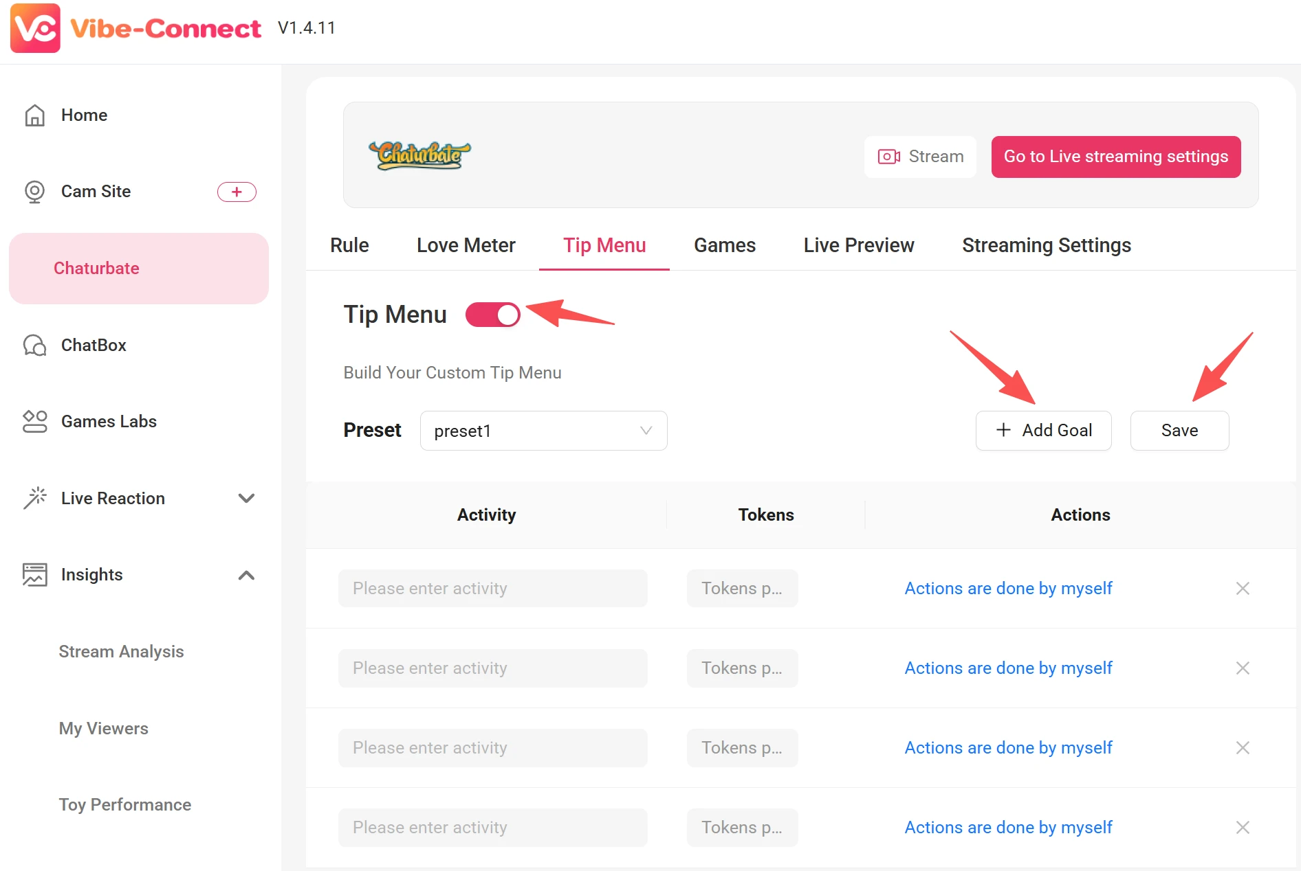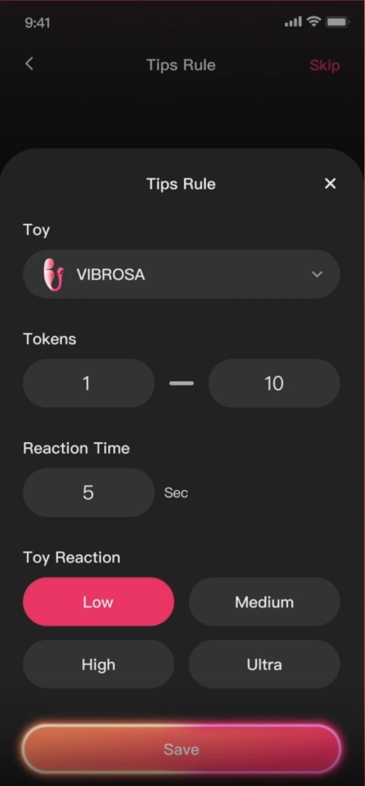 Vibe-Connect increases earnings by making your cam shows more interactive. Viewers are more likely to tip when they see instant reactions from toys or interactive experiences during the stream. You can create customized tip rules and tip menus, for example: