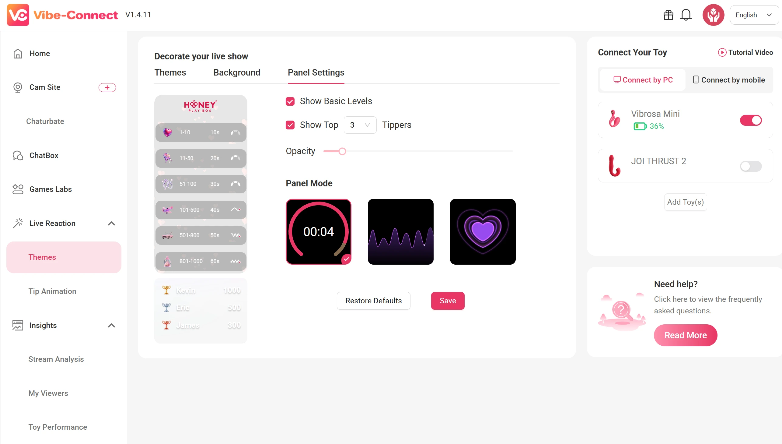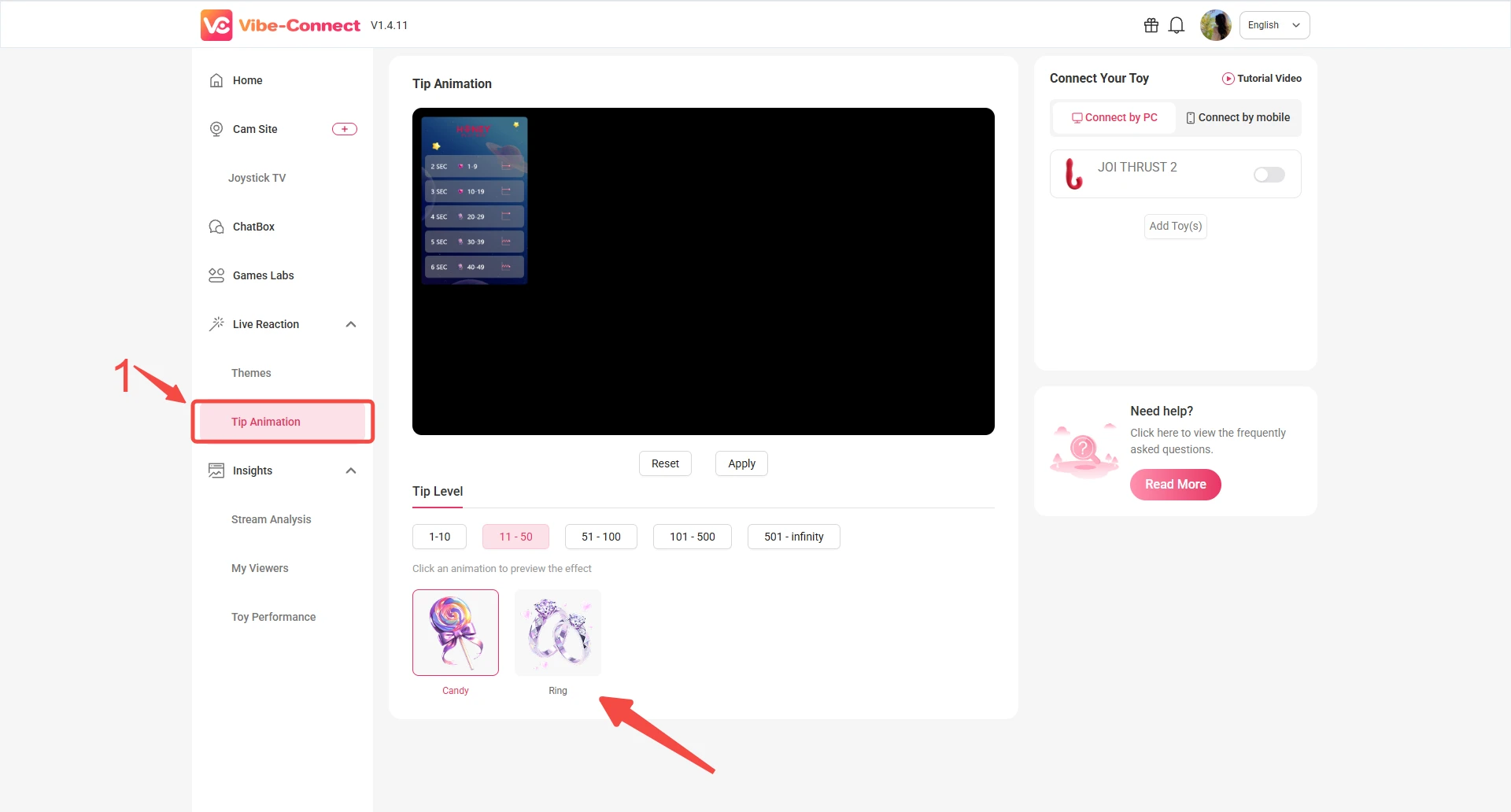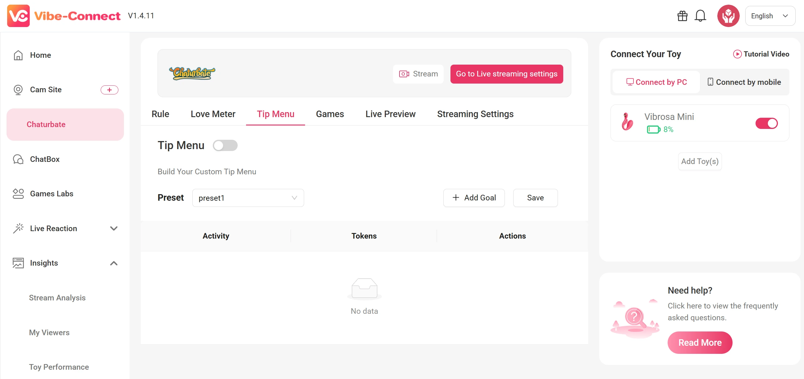 Vibe-Connect increases earnings by making your cam shows more interactive. Viewers are more likely to tip when they see instant reactions from toys or interactive experiences during the stream. You can create customized tip rules and tip menus, for example: