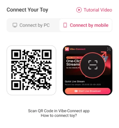 Log in to Vibe-Connect on your computer. In the Connect Your Toy panel, select “Connect by mobile” to activate the QR code.