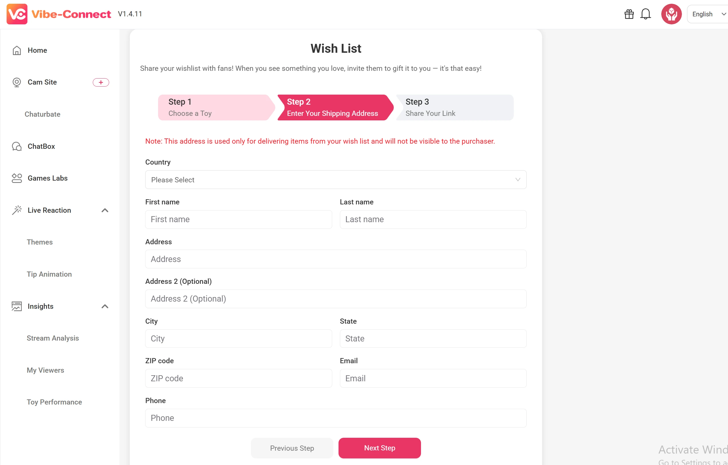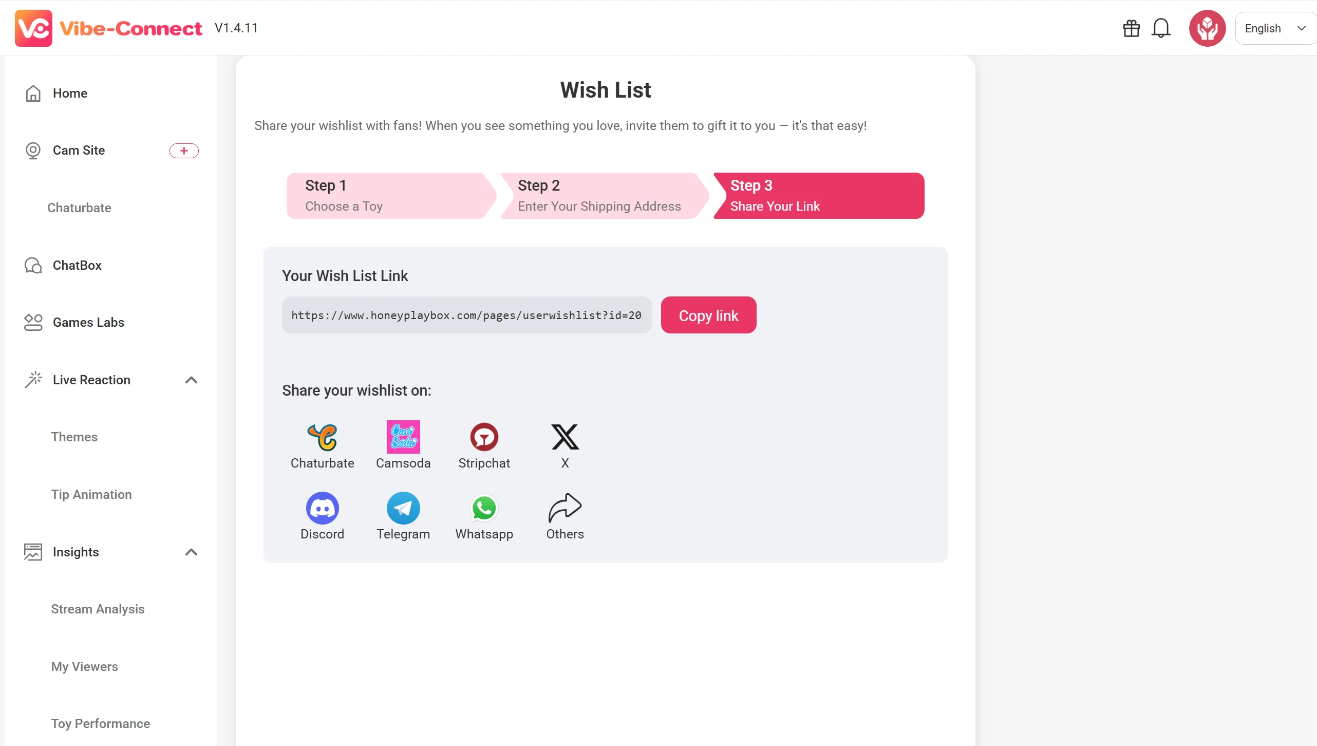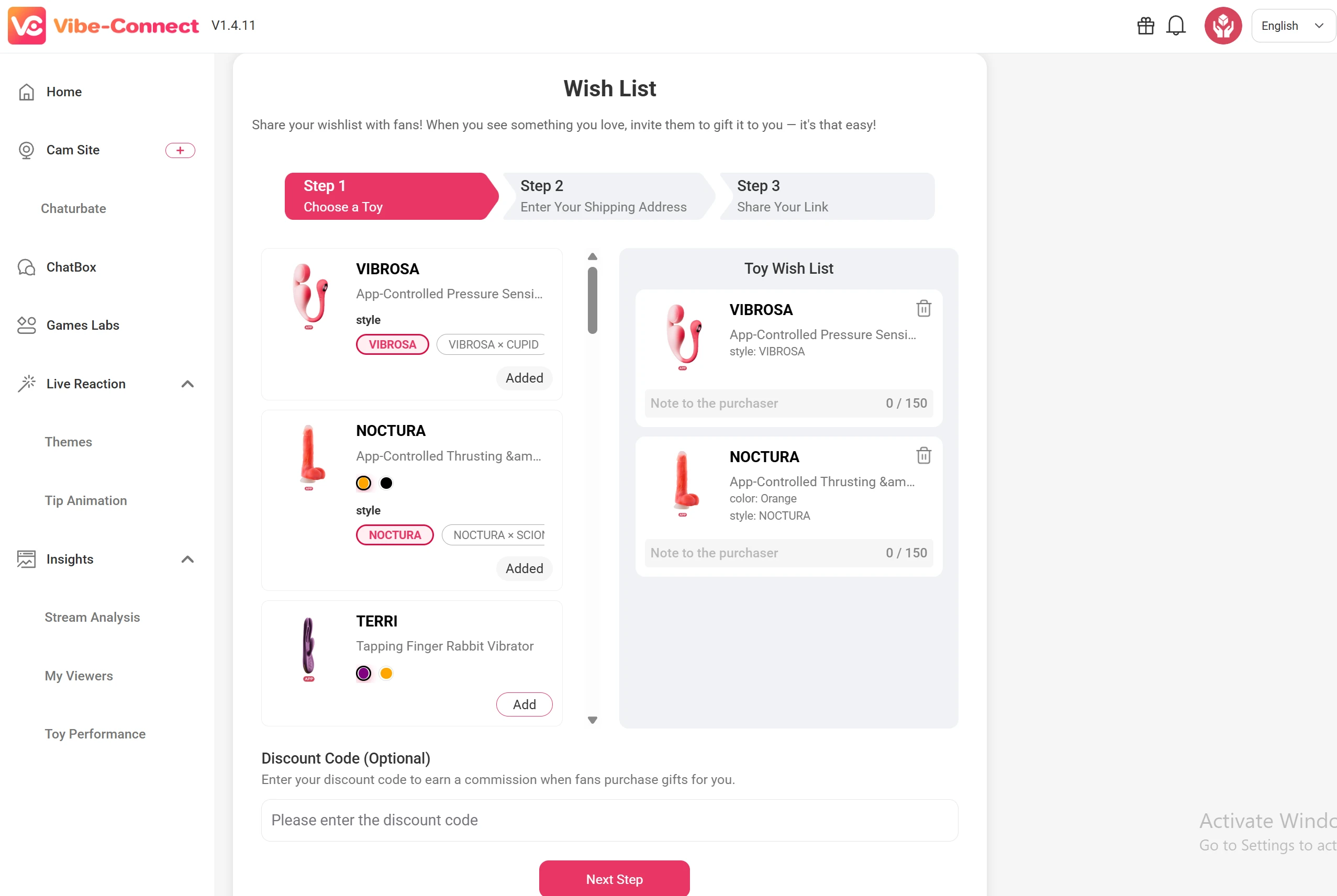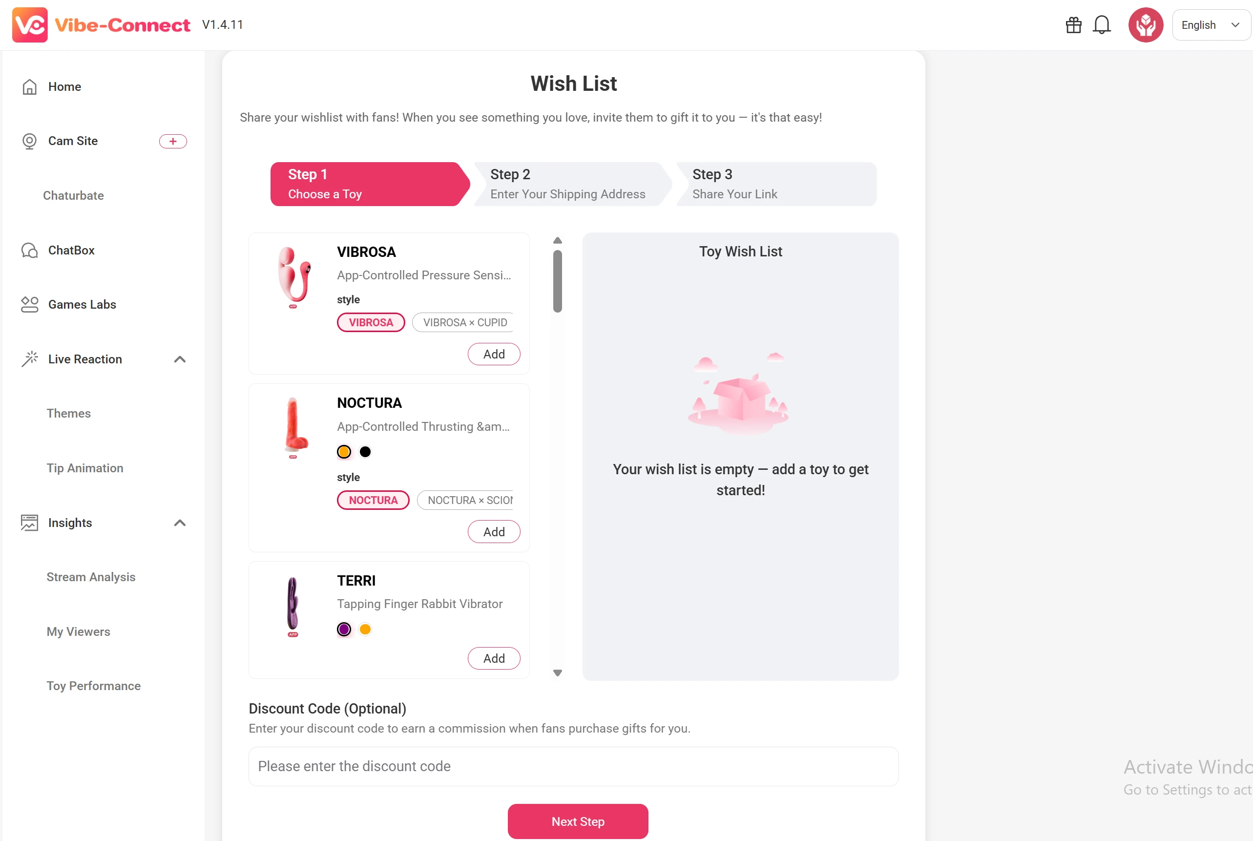 How to use the Wishlist Feature?Does Vibe-Connect have an affiliate program that allows cam models to earn commissions by promoting products? expand_more